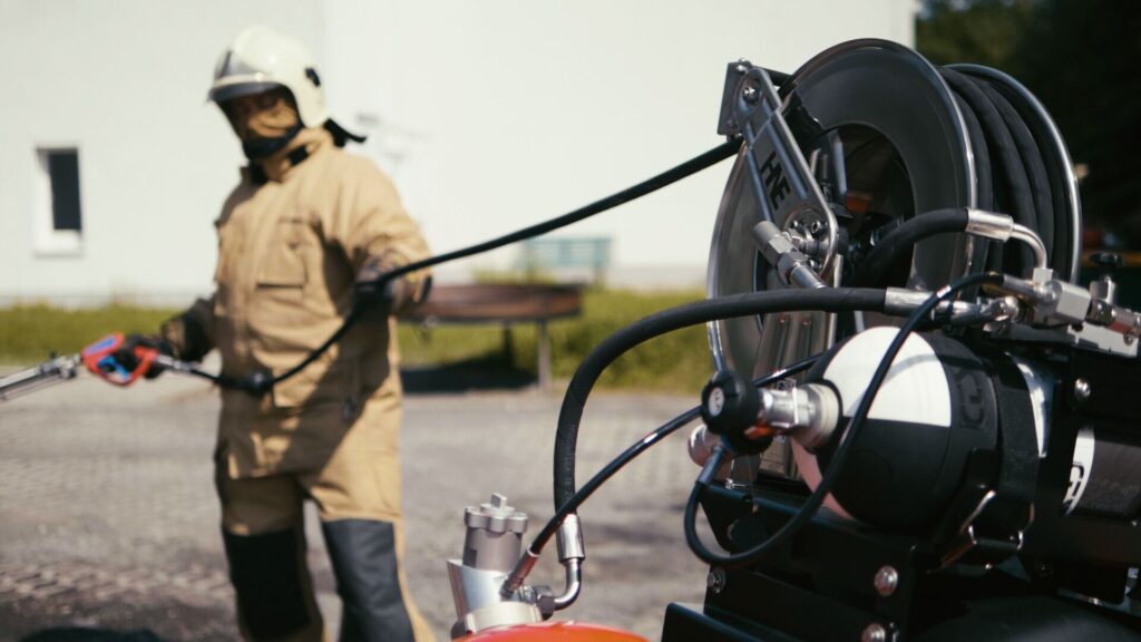 Z delovnim tlakom 29 barov lahko dosežete domet do 19 m. Tako lahko ohranite varno razdaljo od ognja. 15 m cevi na vgrajenem kolutu za cev vam daje še večji obseg delovanja!